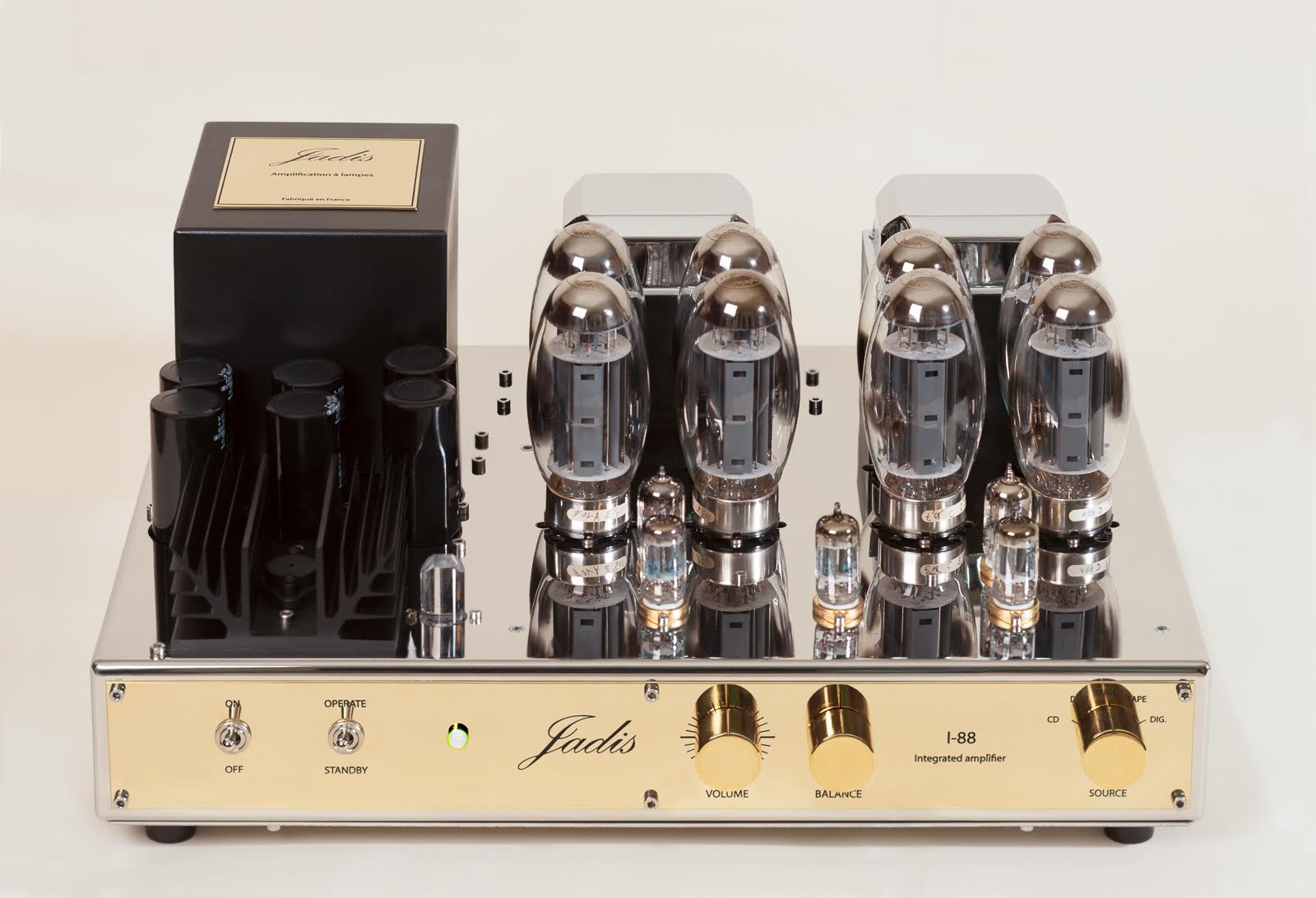 Wzmacniacz zintegrowany I88 to najnowsze urządzenie wykonane przez Jadis. Prototyp został zaprezentowany w ubiegłym roku w Paryżu. Pierwsza produkcyjna sztuka trafiła do firmy Grobel Audio. Osiem lamp KT150 w układzie push-pull oddaje moc 90 W na kanał w czystej klasie A. Podobnie jak w większości wzmacniaczy Jadis prąd podkładu jest ustawiany automatycznie. I88 wyposażony jest w cztery wejścia liniowe, jedno USB z wewnętrznym przetwornikiem, co umożliwia bezpośrednie podanie sygnału na przykład z komputera, oraz jedno wyjście o stałym poziomie napięcia.
