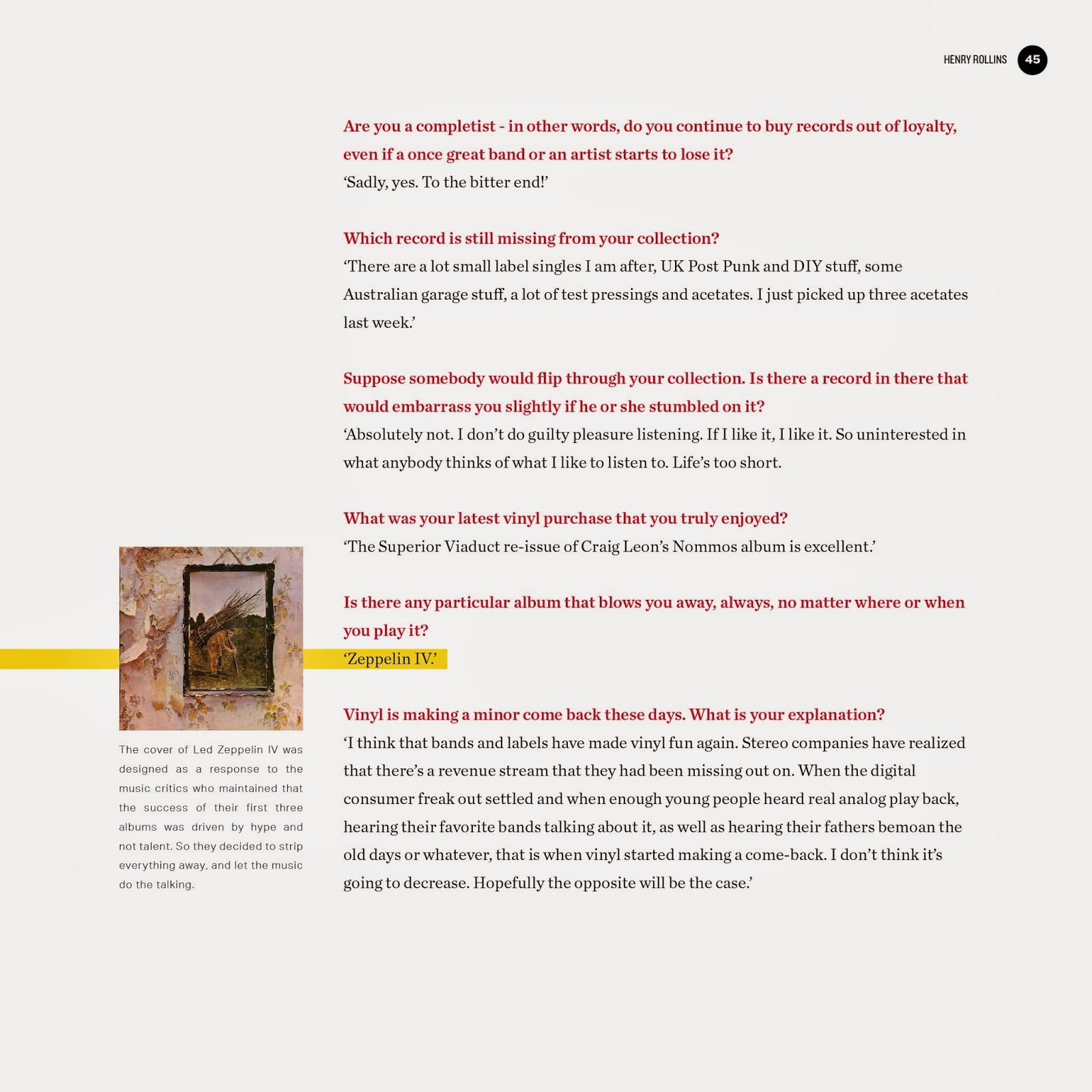 W albumie „Passion for Vinyl”, który ukaże się 25 listopada, podobnych anegdot jest więcej. Bohaterami książki napisanej przez holenderskiego dziennikarza Roberta Haagsma są kolekcjonerzy i miłośnicy winyli, którzy dla swojej pasji są gotowi na wszystko. Są tu sylwetki takich postaci jak Henry Rollins, Bernie Grundman, Hans Pokora, Chris Ellis, Steffi, Mala, Vaughan Oliver, Lee Dorrian, Jacco Gardner, John Dyer Baizley, jest też kilka stron poświęconych Craigowi Kallmanowi, szefowi wytwórni Atlantic i właścicielowi… 750 tys. płyt analogowych, oraz rozdział na temat Record Industry, holenderskiej tłoczni produkujących krążki od lat 50. ubiegłego wieku. „PFV” kosztuje 26 funtów, a więcej o niej – tutaj.